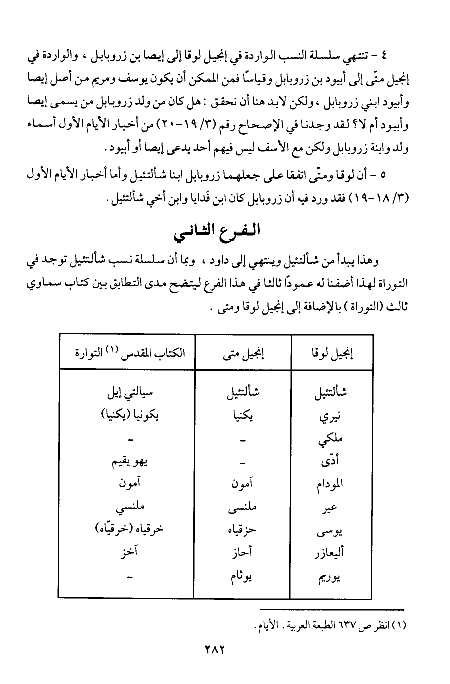 4 - تنتهي سلسلة النسب الواردة في إنجيل لوقا إلى إيصا بن زروبابل، والواردة في إنجيل متى إلى أبيود بن زروبابل وقياسا فمن الممكن أن يكون يوسف ومريم من أصل إيصا وأبيود ابني زروبابل، ولكن لابد هنا أن نحقق: هل كان من ولد زروبابل من يسمى إيصا وأبيود أم لا؟ لقد وجدنا في الإصحاح رقم (3/ 19 - 25) من أخبار الأيام الأول أسماء ولد وابنة زروبابل ولكن مع الأسف ليس فيهم أحد يدعى إيصا أو أبيود.