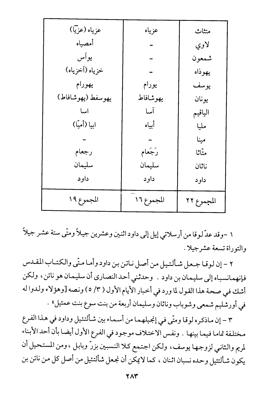 1 - وقد عد لوقا من أرسلاتي إيل إلى داود اثنين وعشرين جيلا ومتى ستة عشر جيلا والتوراة تسعة عشر جيلا.