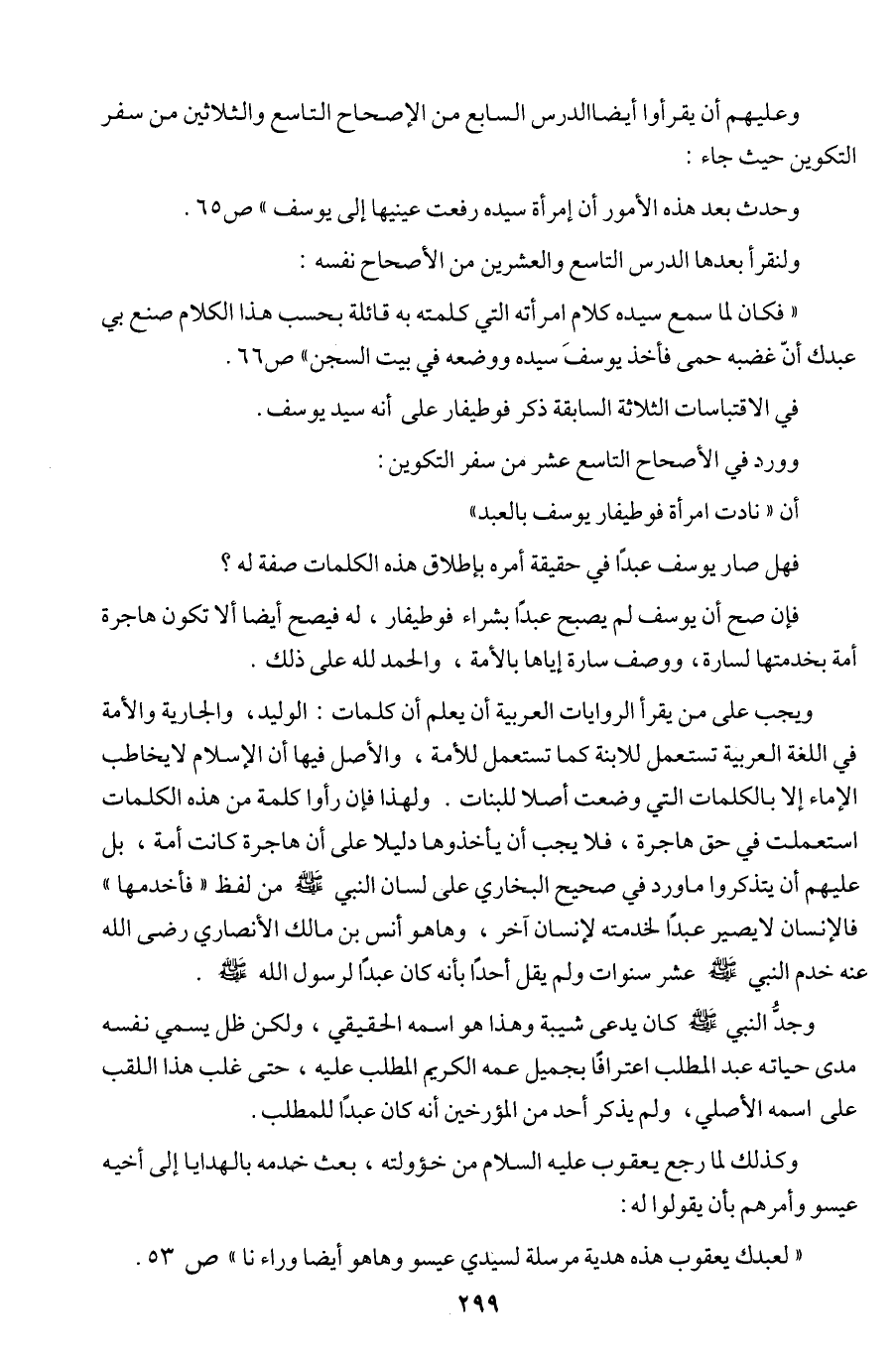 فإن صح أن يوسف لم يصبح عبدا بشراء فوطيفار، له فيصح أيضا ألا تكون هاجرة أمة بخدمتها لسارة، ووصف سارة إياها بالأمة، والحمد لله على ذلك.
