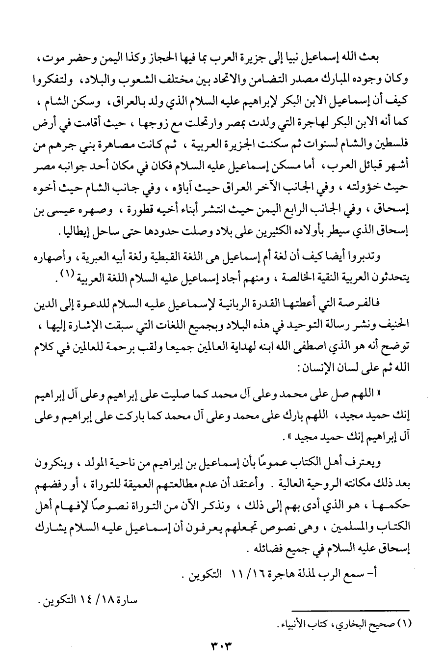 ويعترف أهل الكتاب عموما بأن إسماعيل بن إبراهيم من ناحية المولد، وينكرون بعد ذلك مكانته الروحية العالية. وأعتقد أن عدم مطالعتهم العميقة للتوراة، أو رفضهم حكمها، هو الذي أدى بهم إلى ذلك، ونذكر الآن من التوراة نصوصا لإفهام أهل الكتاب والمسلمين، وهي نصوص تجعلهم يعرفون أن إسماعيل عليه السلام يشارك إسحاق عليه السلام في جميع فضائله.