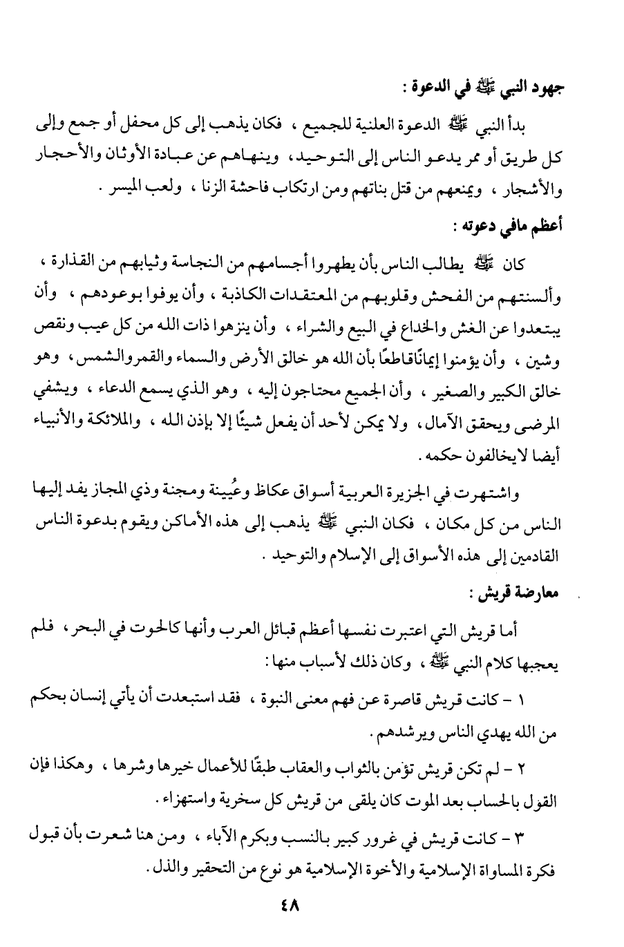 كان - صلى الله عليه وسلم - يطالب الناس بأن يطهروا أجسامهم من النجاسة وثيابهم من القذارة، وألسنتهم من الفحش وقلوبهم من المعتقدات الكاذبة، وأن يوفوا بوعودهم، وأن يبتعدوا عن الغش والخداع في البيع والشراء، وأن ينزهوا ذات الله من كل عيب ونقص وشين، وأن يؤمنوا إيمانا قاطعا بأن الله هو خالق الأرض والسماء والقمر والشمس، وهو خالق الكبير والصغير، وأن الجميع محتاجون إليه، وهو الذي يسمع الدعاء، ويشفي المرضى ويحقق الآمال، ولا يمكن لأحد أن يفعل شيئا إلا بإذن الله، والملائكة والأنبياء أيضا لا يخالفون حكمه.