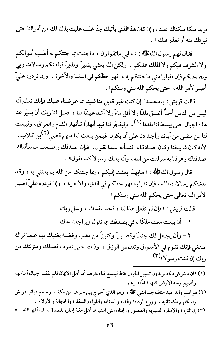 2 - وأن يجعل لك جنانا وقصورا وكنوزا من ذهب وفضة يغنيك بها عما نراك تبتغي فإنك تقوم في الأسواق وتلتمس الرزق، وذلك حتى نعرف فضلك ومنزلتك من ربك إن كنت رسولا" (¬3).