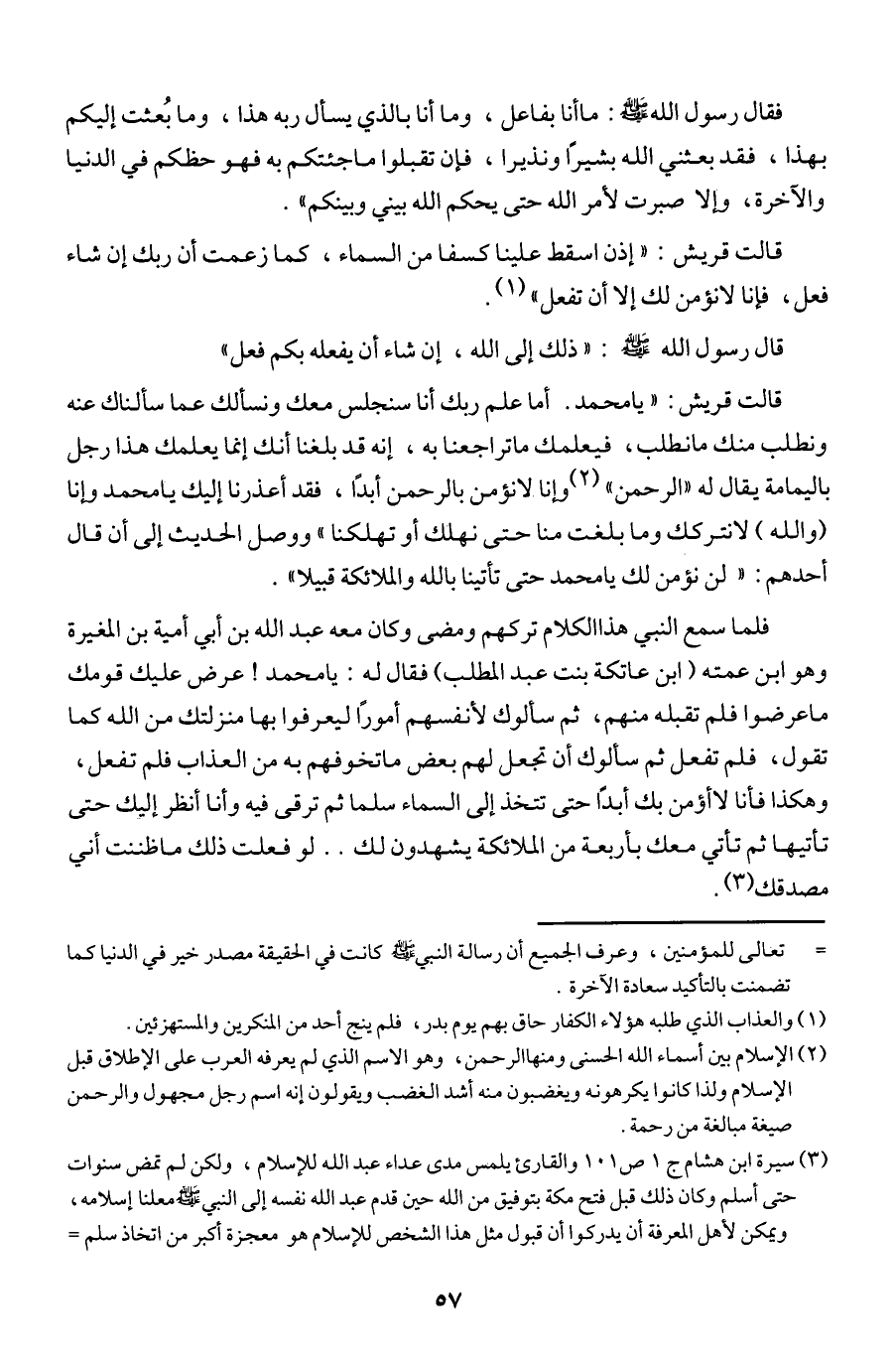 فلما سمع النبي هذا الكلام تركهم ومضى وكان معه عبد الله بن أبي أمية بن المغيرة وهو ابن عمته (ابن عاتكة بنت عبد المطلب) ققال له: يا محمد! عرض عليك قومك ما عوضوا فلم تقبله منهم، ثم سألوك لأنفسهم أمورا ليعرفوا بها منزلتك من الله كما تقول، فلم تفعل ثم سألوك أن تجعل لهم بعض ما تخوفهم به من العذاب فلم تفعل، وهكذا فأنا لا أؤمن بك أبدا حتى تتخذ إلى السماء سلما ثم ترقى فيه وأنا أنظر إليك حتى تأتيها ثم تأتي معك بأربعة من الملائكة يشهدون لك .. لو فعلت ذلك ما ظننت أني مصدقك (¬3).