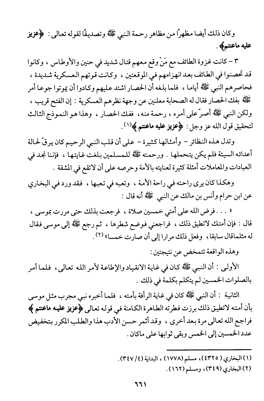 وتدل هذه النظائر - وأمثالها كثيرة - على أن قلب النبي (ص) الرحيم كان يرق لحالة أعدائه السيئة فلم يكن يتحملها. ورحمته (ص) للمسلمين بلغت غايتها، فإننا نجد في العبادات والمعاملات أمثلة كثيرة لعنايته بالأمة وحرصه على أن لا تقع في المشقة.