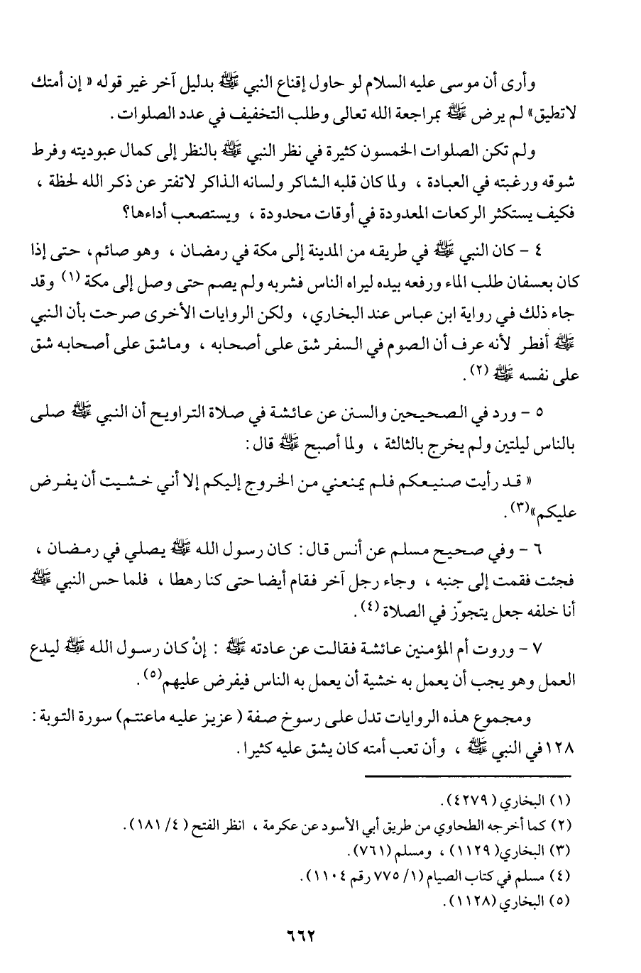 7 - وروت أم المؤمنين عائشة فقالت عن عادته (ص): إن كان رسول الله (ص) ليدع العمل وهو يجب أن يعمل به خشية أن يعمل به الناس فيفرض عليهم (¬5).