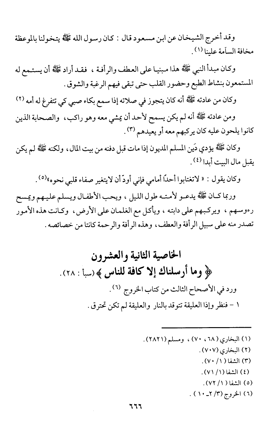 وربما كان (ص) يدعو لأمته طول الليل، ويحب الأطفال ويسلم عليهم ويمسح رءوسهم، ويركبهم على دابته، ويأكل مع الغلمان على الأرض، وكانت هذه الأمور تصدر منه على سبيل الرأفة والعطف، وهذه الرأفة والرحمة كانتا من خصائصه.