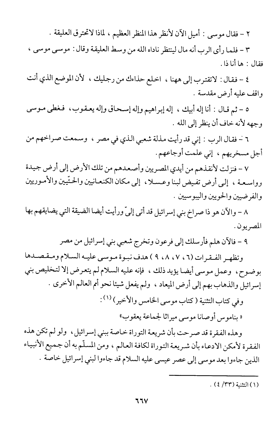 وتظهر الفقرات (6، 7، 8، 9) هدف نبوة موسى عليه السلام ومقصدها بوضوح، وعمل موسى أيضا يؤيد ذلك، فإنه عليه السلام لم يتعرض إلا لتخليص بني إسرائيل والذهاب بهم إلى أرض الميعاد، ولم يفعل شيئا نحو أمم العالم الأخرى.