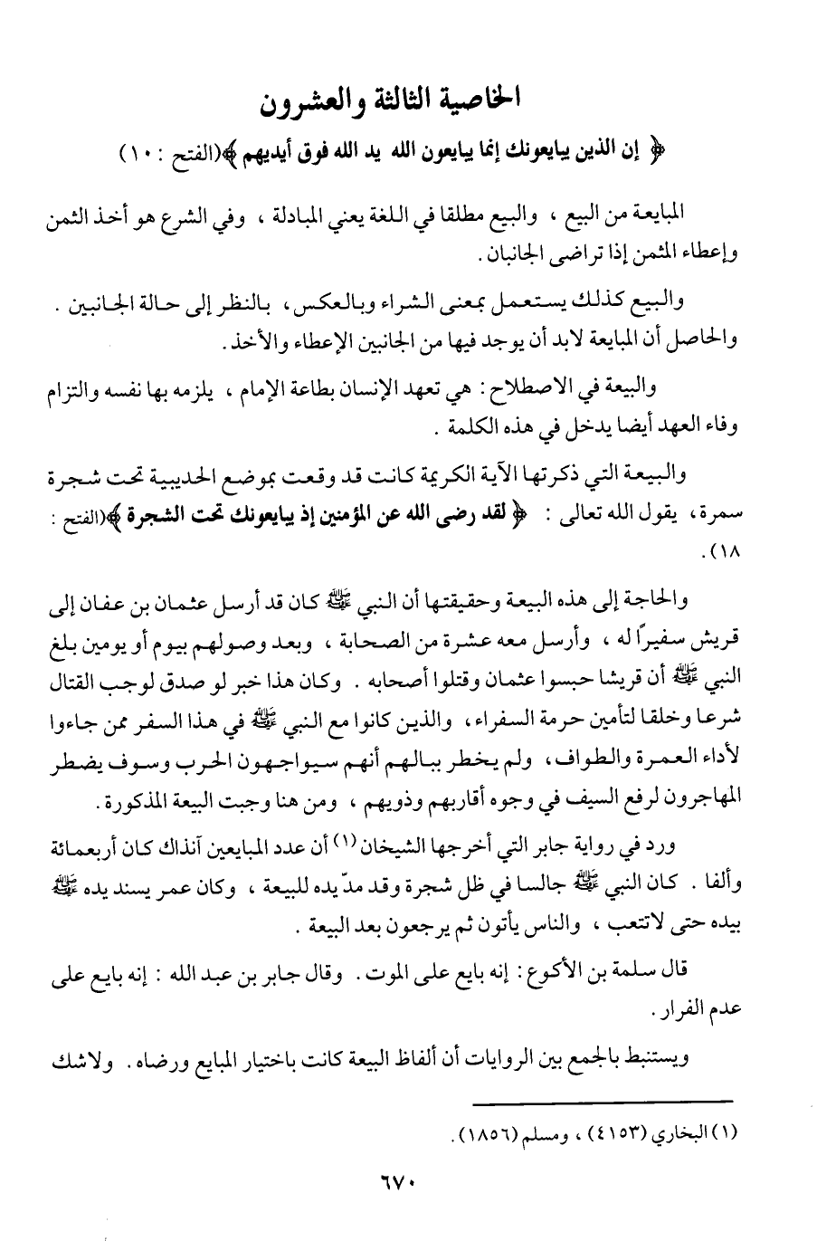 والحاجة إلى هذه البيعة وحقيقتها أن النبي (ص) كان قد أرسل عثمان بن عفان إلى قريش سفيرا له، وأرسل معه عشرة من الصحابة، وبعد وصولهم بيوم أو يومين بلغ النبي (ص) أن قريشا حبسوا عثمان وقتلوا أصحابه. وكان هذا خبر لو صدق لوجب القتال شرعا وخلقا لتأمين حرمة السفراء، والذين كانوا مع النبي (ص) في هذا السفر ممن جاءوا لأداء العمرة والطواف، ولم يخطر ببالهم أنهم سيواجهون الحرب وسوف يضطر المهاجرون لرفع السيف في وجوه أقاربهم وذويهم، ومن هنا وجبت البيعة المذكورة. ورد في رواية جابر التي أخرجها الشيخان (¬1) أن عدد المبايعين آنذاك كان أربعمائة وألفا. كان النبي (ص) جالسا في ظل شجرة وقد مد يده للبيعة، وكان عمر يسند يده (ص) بيده حتى لا تتعب، والناس يأتون ثم يرجعون بعد البيعة.