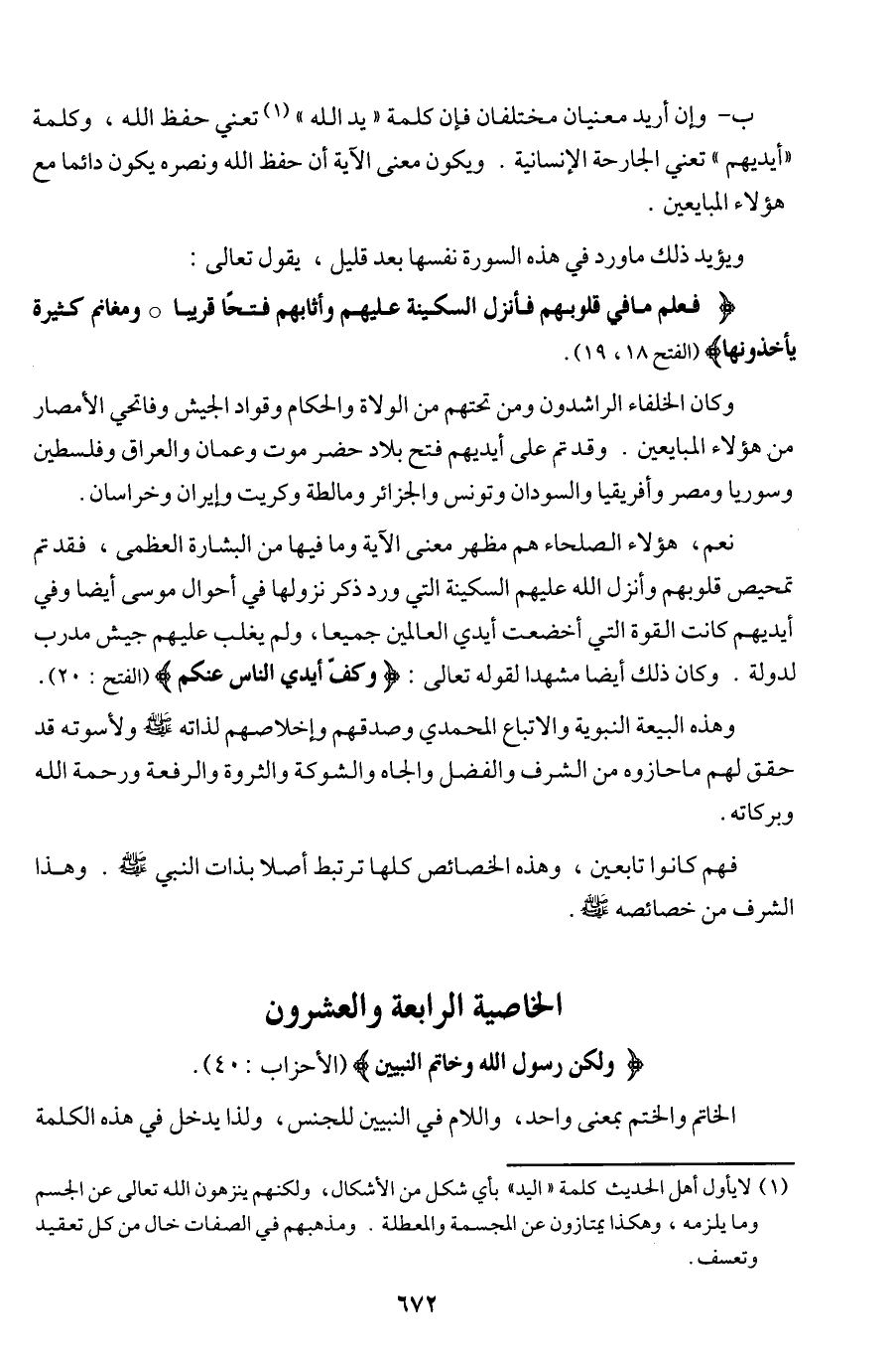 (¬1) لا يأول أهل الحديث كلمة ((اليد)) بأي شكل من الأشكال، ولكنهم ينزهون الله تعالى عن الجسم وما يلزمه، وهكذا يمتازون عن المجسمة والمعطلة. ومذهبهم في الصفات خال من كل تعقيد وتعسف.