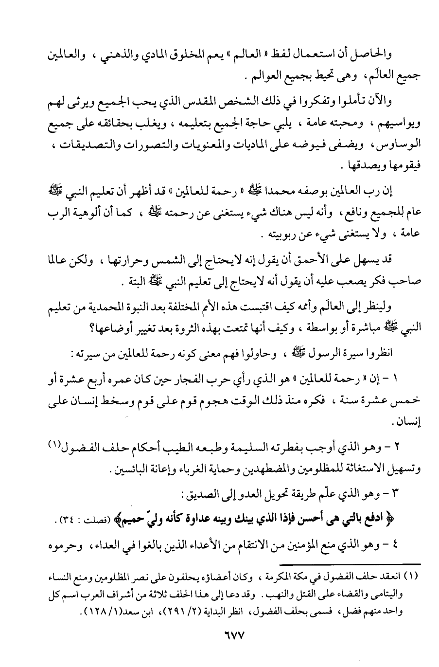 1 - إن ((رحمة للعالمين)) هو الذي رأى حرب الفجار حين كان عمره أربع عشرة أو خمس عشرة سنة، فكره منذ ذلك الوقت هجوم قوم على قوم وسخط إنسان على إنسان.