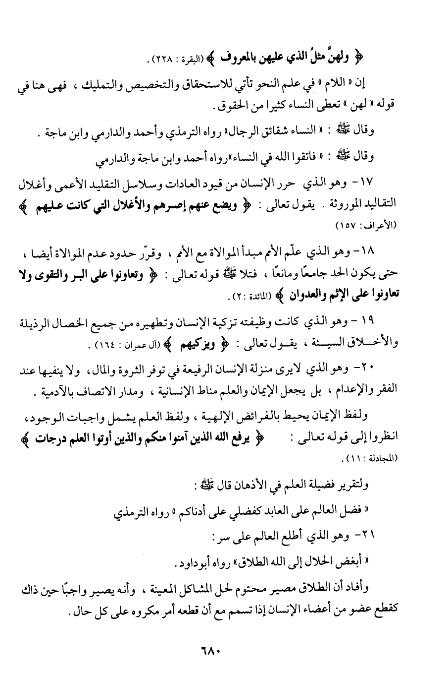 17 - وهو الذي حرر الإنسان من قيود العادات وسلاسل التقليد الأعمى وأغلال التقاليد الموروثة. يقول تعالى: {ويضع عنهم إصرهم والأغلال التي كانت عليهم} (الأعراف: 157).
