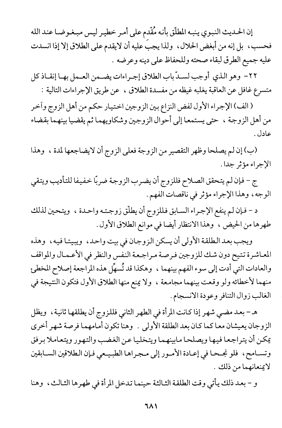 22 - وهو الذي أوجب لسد باب الطلاق إجراءات يضمن العمل بها إنقاذ كل متسرع غافل عن العاقبة يغلبه غيظه من مفسدة الطلاق، عن طريق الإجراءات التالية: (الف) الإجراء الأول لفض النزاع بين الزوجين اختيار حكم من أهل الزوج وآخر من أهل الزوجة، حتى يستمعا إلى أحوال الزوجين وشكاويهما ثم يقضيا بينهما بقضاء عادل.