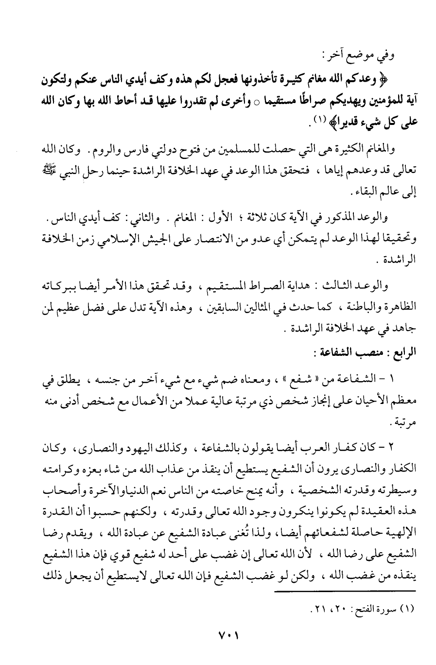 والوعد الثالث: هداية الصراط المستقيم، وقد تحقق هذا الأمر أيضا ببركاته الظاهرة والباطنة، كما حدث في المثالين السابقين، وهذه الآية تدل على فضل عظيم لمن جاهد في عهد الخلافة الراشدة. الرابع: منصب الشفاعة:
