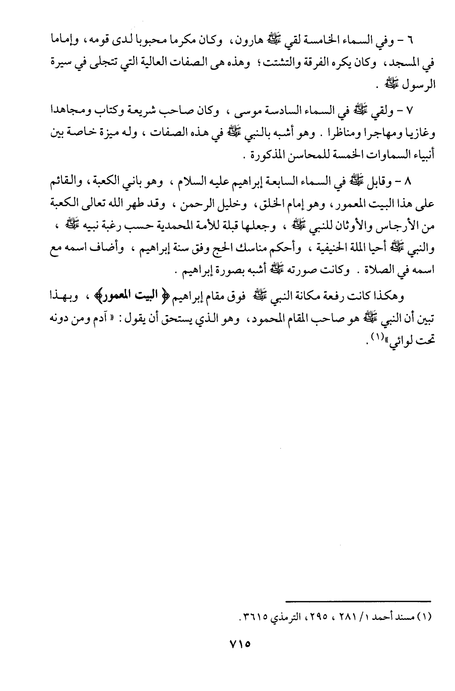 7 - ولقي (ص) في السماء السادسة موسى، وكان صاحب شريعة وكتاب ومجاهدا وغازيا ومهاجرا ومناظرا. وهو أشبه بالنبي (ص) في هذه الصفات، وله ميزة خاصة بين أنبياء السماوات الخمسة للمحاسن المذكورة.