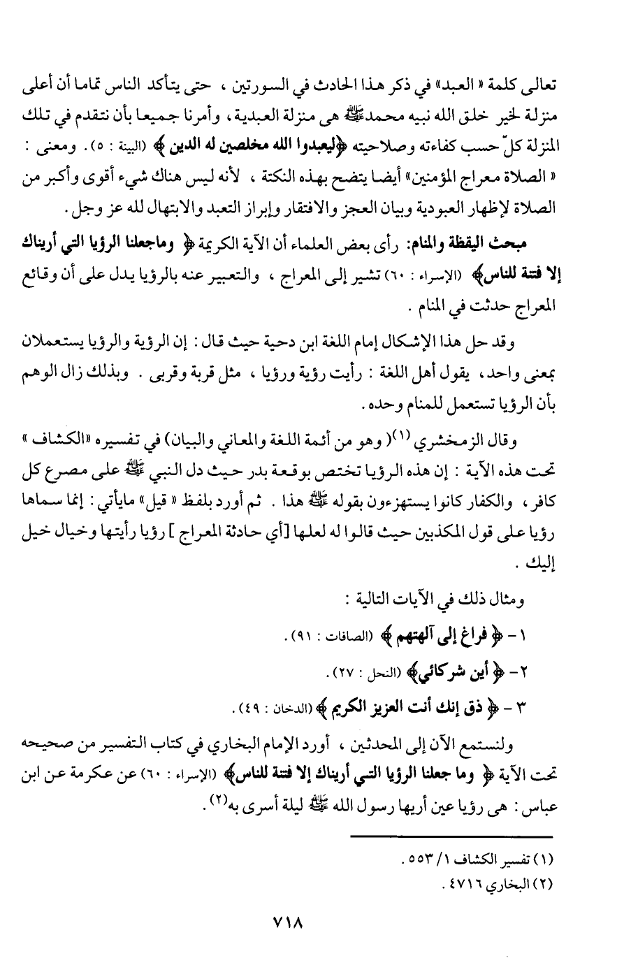 ولنستمع الآن إلى المحدثين، أورد الإمام البخاري في كتاب التفسير من صحيحه تحت الآية {وما جعلنا الرؤيا التي أريناك إلا فتنة للناس} (الإسراء: 60) عن عكرمة عن ابن عباس: هي رؤيا عين أريها رسول الله (ص) ليلة أسرى به (¬2).