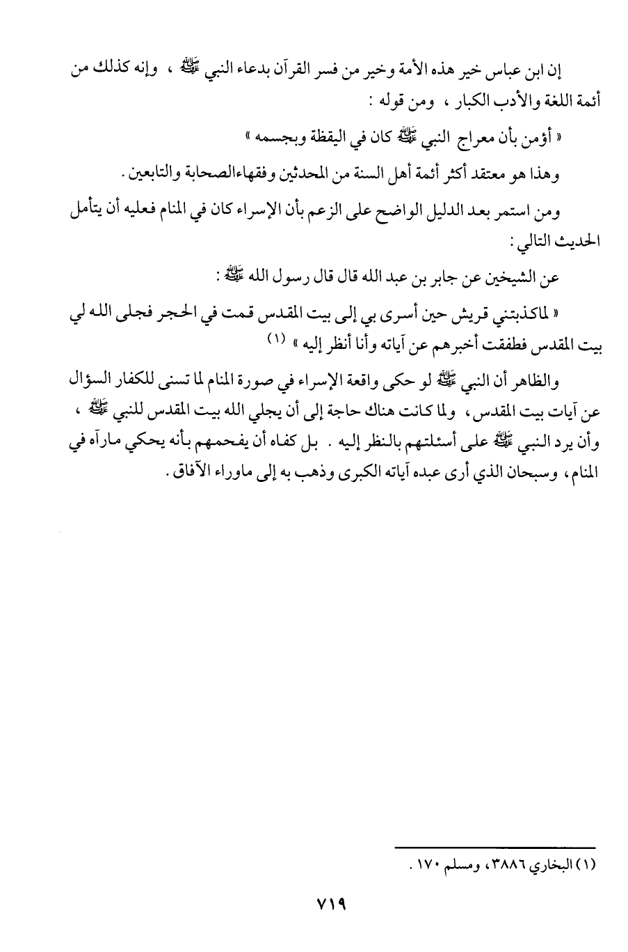 والظاهر أن النبي (ص) لو حكى واقعة الإسراء في صورة المنام لما تسنى للكفار السؤال عن آيات بيت القدس، ولما كانت هناك حاجة إلى أن يجلي الله بيت المقدس للنبي (ص)، وأن يرد النبي (ص) على أسئلتهم بالنظر إليه. بل كفاه أن يفحمهم بأنه يحكي ما رآه في المنام، وسبحان الذي أرى عبده آياته الكبرى وذهب به إلى ما وراء الآفاق.