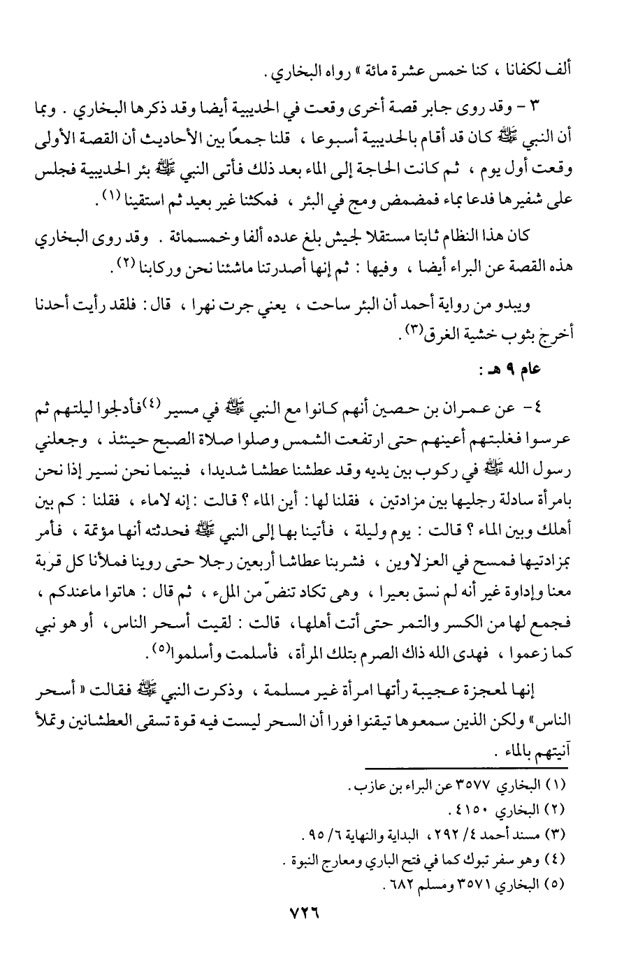 3 - وقد روى جابر قصة أخرى وقعت في الحديبية أيضا وقد ذكرها البخاري. وبما أن النبي (ص) كان قد أقام بالحديبية أسبوعا، قلنا جمعا بين الأحاديث أن القصة الأولى وقعت أول يوم، ثم كانت الحاجة إلى الماء بعد ذلك فأتى النبي (ص) بئر الحديبية فجلس على شفيرها فدعا بماء فمضمض ومج في البئر، فمكثنا غير بعيد ثم استقينا (¬1).