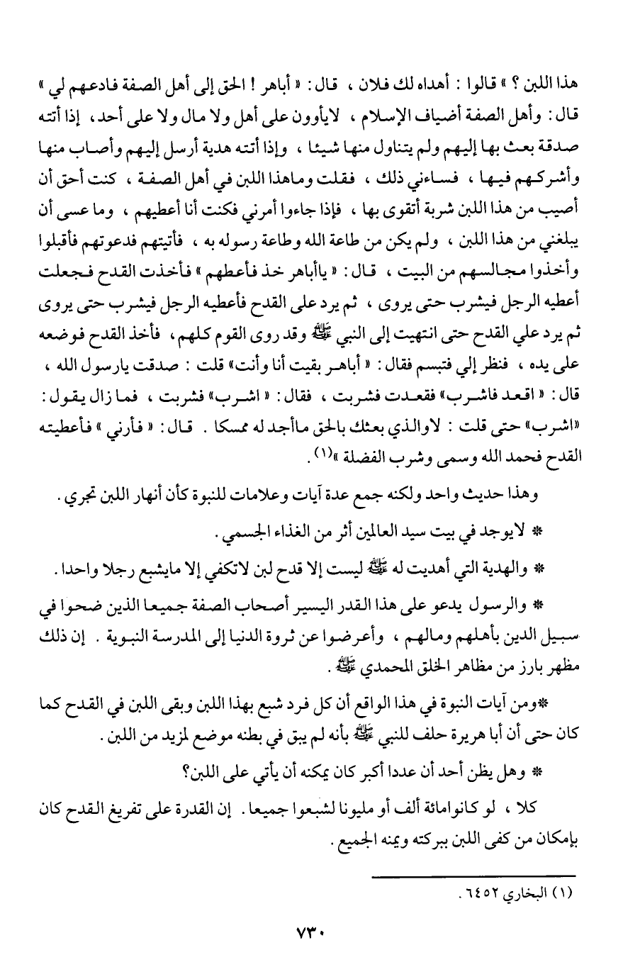 * ومن آيات النبوة في هذا الواقع أن كل فرد شبع بهذا اللبن وبقى اللبن في القدح كما كان حتى أن أبا هريرة حلف للنبي (ص) بأنه لم يبق في بطنه موضع لمزيد من اللبن.