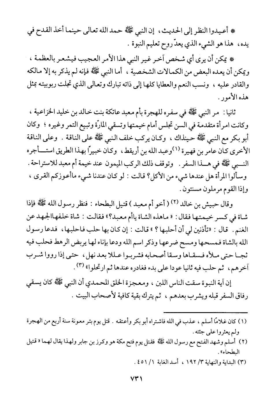 ثانيا: مر النبي (ص) في سفره للهجرة بأم معبد عاتكة بنت خالد بن خليد الخزاعية، وكانت امرأة متقدمة في السن تجلس أمام خيمتها وتسقي المارة وتبيع التمر وغيره؛ وكان أبو بكر مع النبي (ص) حينذاك، وكان يركب خلف النبي (ص) على الناقة. وعلى الناقة الأخرى كان عامر بن فهيرة (¬1) وعبد الله بن أريقط، وكان خبيرا بهذا الطريق استأجره النبي (ص) في هذا السفر. وتوقف ذلك الركب الميمون عند خيمة أم معبد للاستراحة. وسألوا المرأة هل عندها شيء من الأكل؟ قالت: لو كان عندنا شيء ما أعوزكم القرى، وإذا القوم مرملون مسنتون.