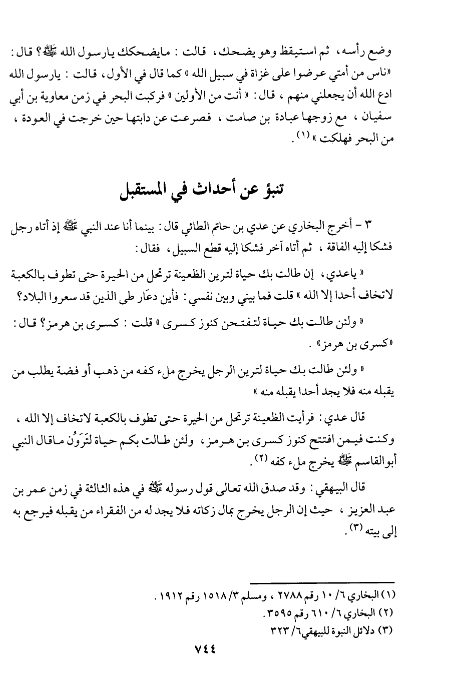3 - أخرج البخاري عن عدي بن حاتم الطائي قال: بينما أنا عند النبي (ص) إذ أتاه رجل فشكا إليه الفاقة، ثم أتاه آخر فشكا إليه قطع السبيل، فقال: