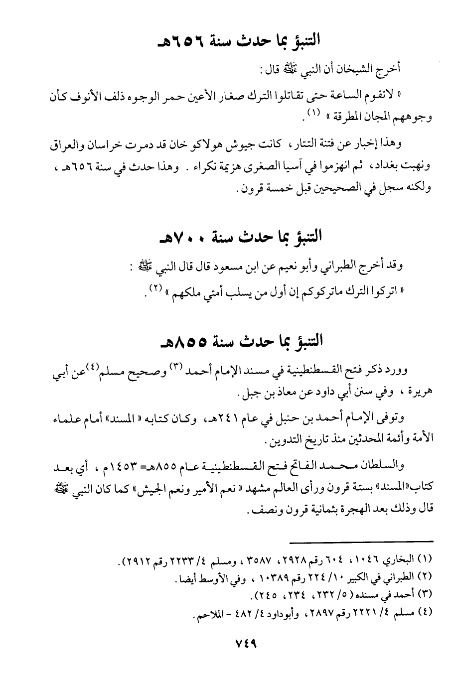والسلطان محمد الفاتح فتح القسطنطينية عام 855 هـ = 1453 م، أي بعد كتابا (المسند) بستة قرون ورأى العالم مشهد ((نعم الأمير ونعم الجيش)) كما كان النبي (ص) قال وذلك بعد الهجرة بثمانية قرون ونصف.