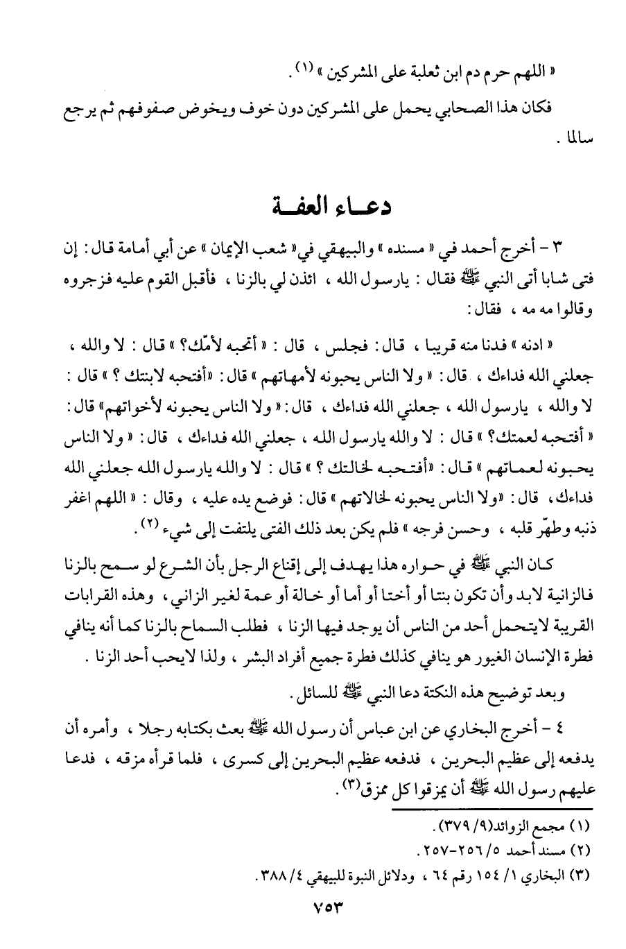 3 - أخرج أحمد في ((مسنده)) والبيهقي في ((شعب الإيمان)) عن أبي أمامة قال: إن فتى شابا أتى النبي (ص) فقال: يا رسول الله، ائذن لي بالزنا، فأقبل القوم عليه فزجروه وقالوا مه مه، فقال: