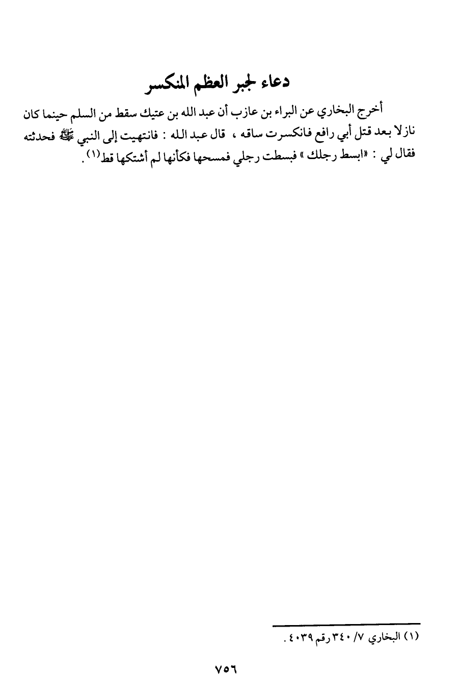 أخرج البخاري عن البراء بن عازب أن عبد الله بن عتيك سقط من السلم حينما كان نازلا بعد قتل أبي رافع فانكسرت ساقه، قال عبد الله: فانتهيت إلى النبي (ص) فحدثته فقال لي: ((ابسط رجلك)) فبسطت رجلي فمسحها فكأنها لم أشتكها قط (¬1).