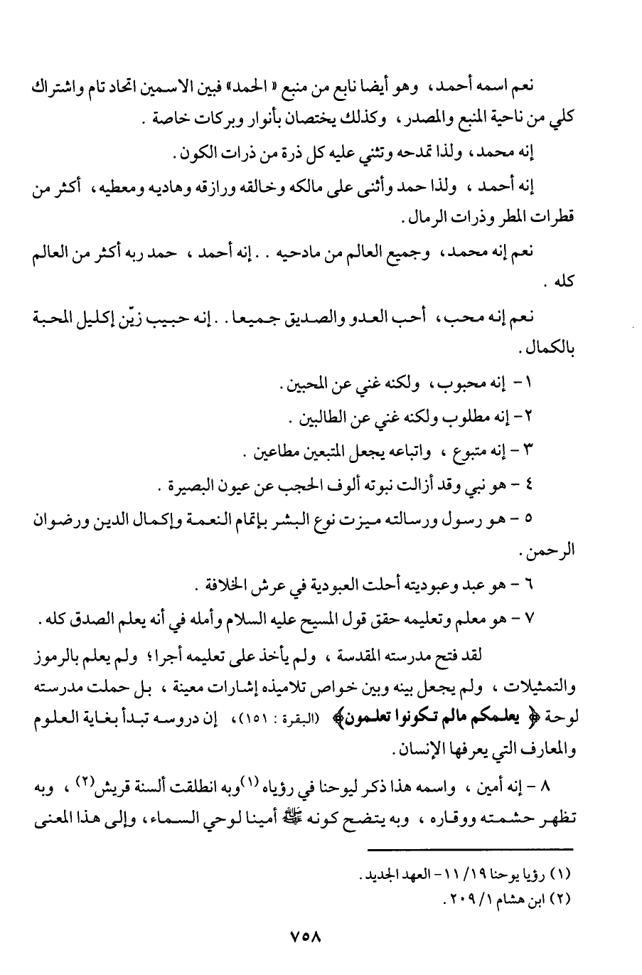 نعم اسمه أحمد، وهو أيضا نابع من منبع ((الحمد)) فبين الاسمين اتحاد تام واشتراك كلي من ناحية المنبع والمصدر، وكذلك يختصان بأنوار وبركات خاصة. إنه محمد، ولذا تمدحه وتثني عليه كل ذرة من ذرات الكون. إنه أحمد، ولذا حمد وأثتى على مالكه وخالقه ورازقه وهاديه ومعطيه، أكثر من قطرات المطر وذرات الرمال.