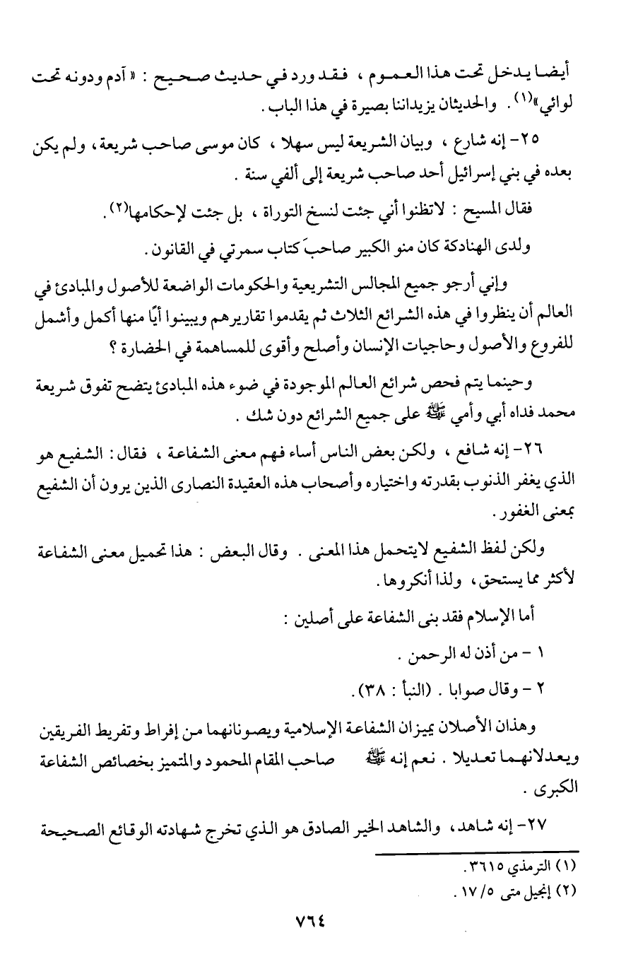 26 - إنه شافع، ولكن بعض الناس أساء فهم معنى الشفاعة، فقال: الشفيع هو الذي يغفر الذنوب بقدرته واختياره وأصحاب هذه العقيدة النصارى الذين يرون أن الشفيع بمعنى الغفور.
