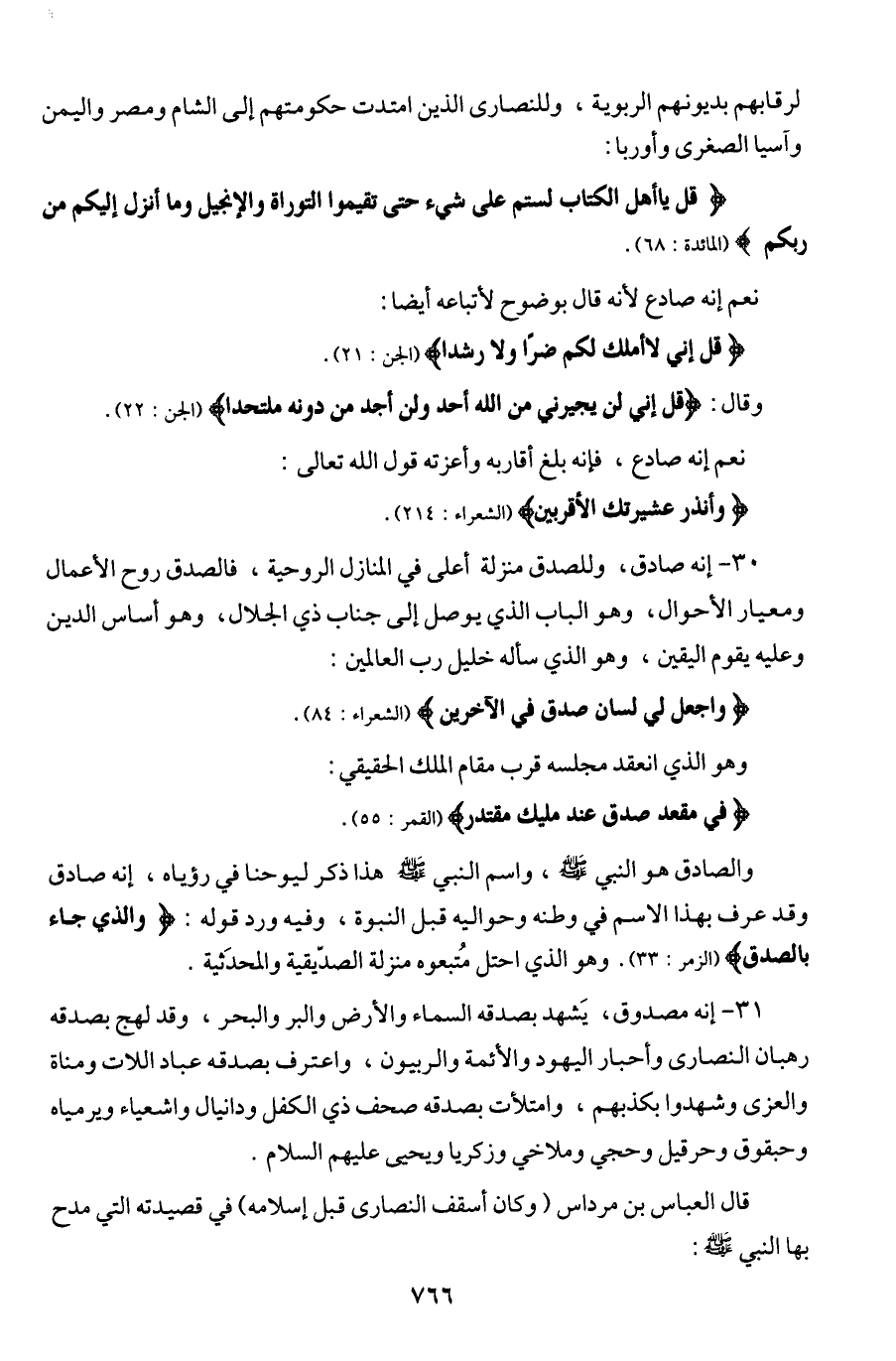 30 - إنه صادق، وللصدق منزلة أعلى في المنازل الروحية، فالصدق روح الأعمال ومعيار الأحوال، وهو الباب الذي يوصل إلى جناب ذي الجلال، وهو أساس الدين وعليه يقوم اليقين، وهو الذي سأله خليل رب العالمين: {واجعل لي لسان صدق في الآخرين} (الشعراء: 84).
