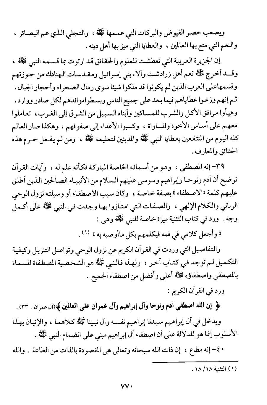 39 - إنه المصطفى، وهو من أسمائه الخاصة المباركة فكأنه علم له، وآيات القرآن توضح أن آدم ونوحا وإبراهيم وموسى عليهم السلام من الأنبياء الصالحين الذين أطلق عليهم كلمة ((الاصطفاء)) بصفة خاصة، وكان سبب الاصطفاء أو وسيلته نزول الوحي الرباني والكلام الإلهي، والصفات التي امتازوا بها وجدت في النبي (ص) على أكمل وجه. ورد في كتاب التثنية ميزة خاصة للنبي (ص) وهي: