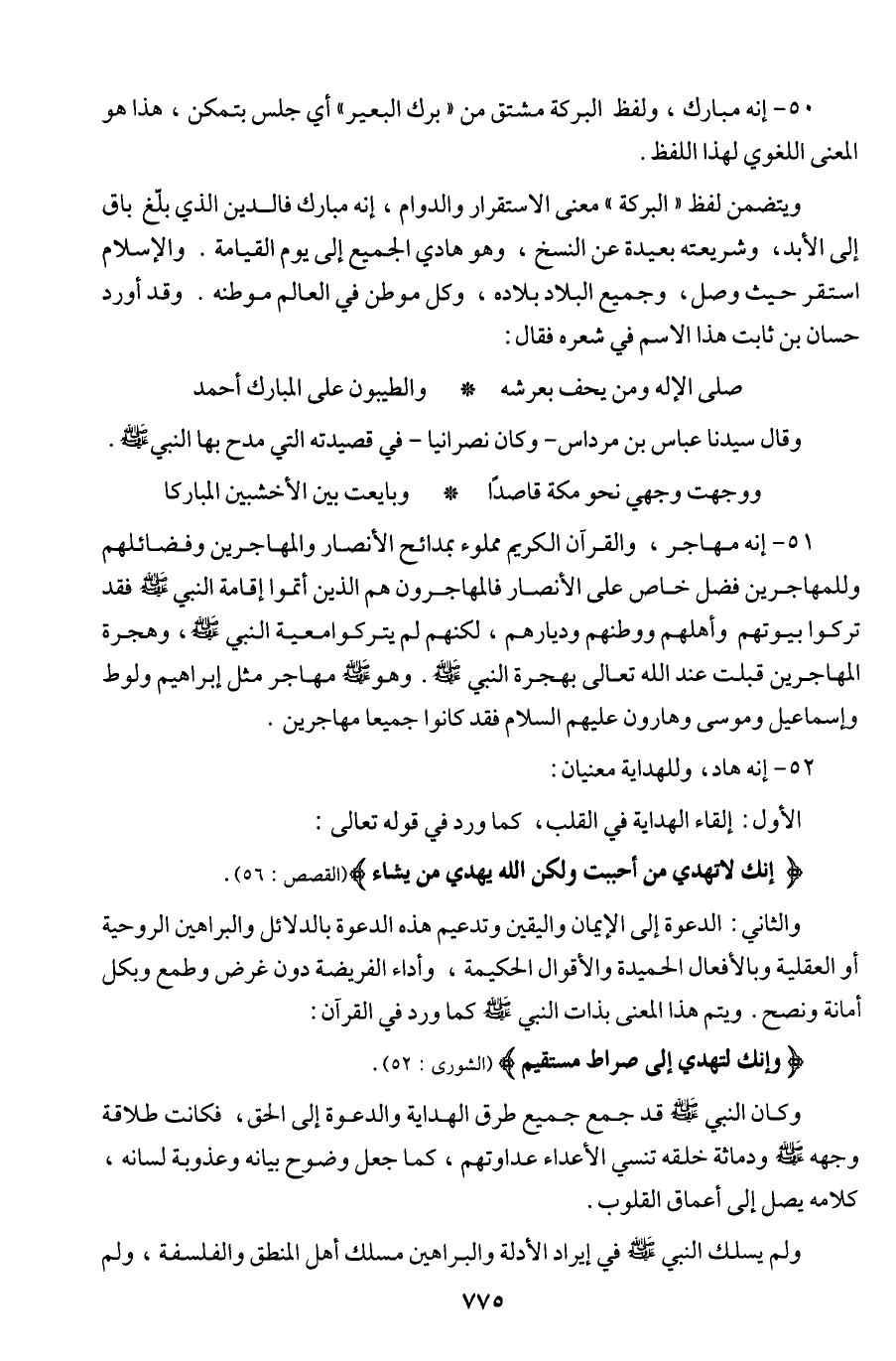 51 - إنه مهاجر، والقرآن الكريم مملوء بمدائح الأنصار والمهاجرين وفضائلهم وللمهاجرين فضل خاص على الأنصار فالمهاجرون هم الذين أتموا إقامة النبي (ص) فقد تركوا بيوتهم وأهلهم ووطنهم وديارهم، لكنهم لم يتركوا معية النبي (ص)، وهجرة المهاجرين قبلت عند الله تعالى بهجرة النبي (ص). وهو (ص) مهاجر مثل إبراهيم ولوط وإسماعيل وموسى وهارون عليهم السلام فقد كانوا جميعا مهاجرين. 52 - إنه هاد، وللهداية معنيان: