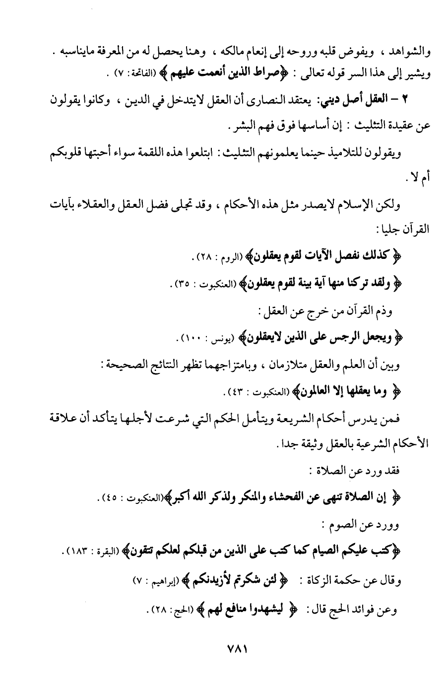 {كذلك نفصل الآيات لقوم يعقلون} (الروم: 28). {ولقد تركنا منها آية بينة لقوم يعقلون} (العنكبوت: 35). وذم القرآن من خرج عن العقل: