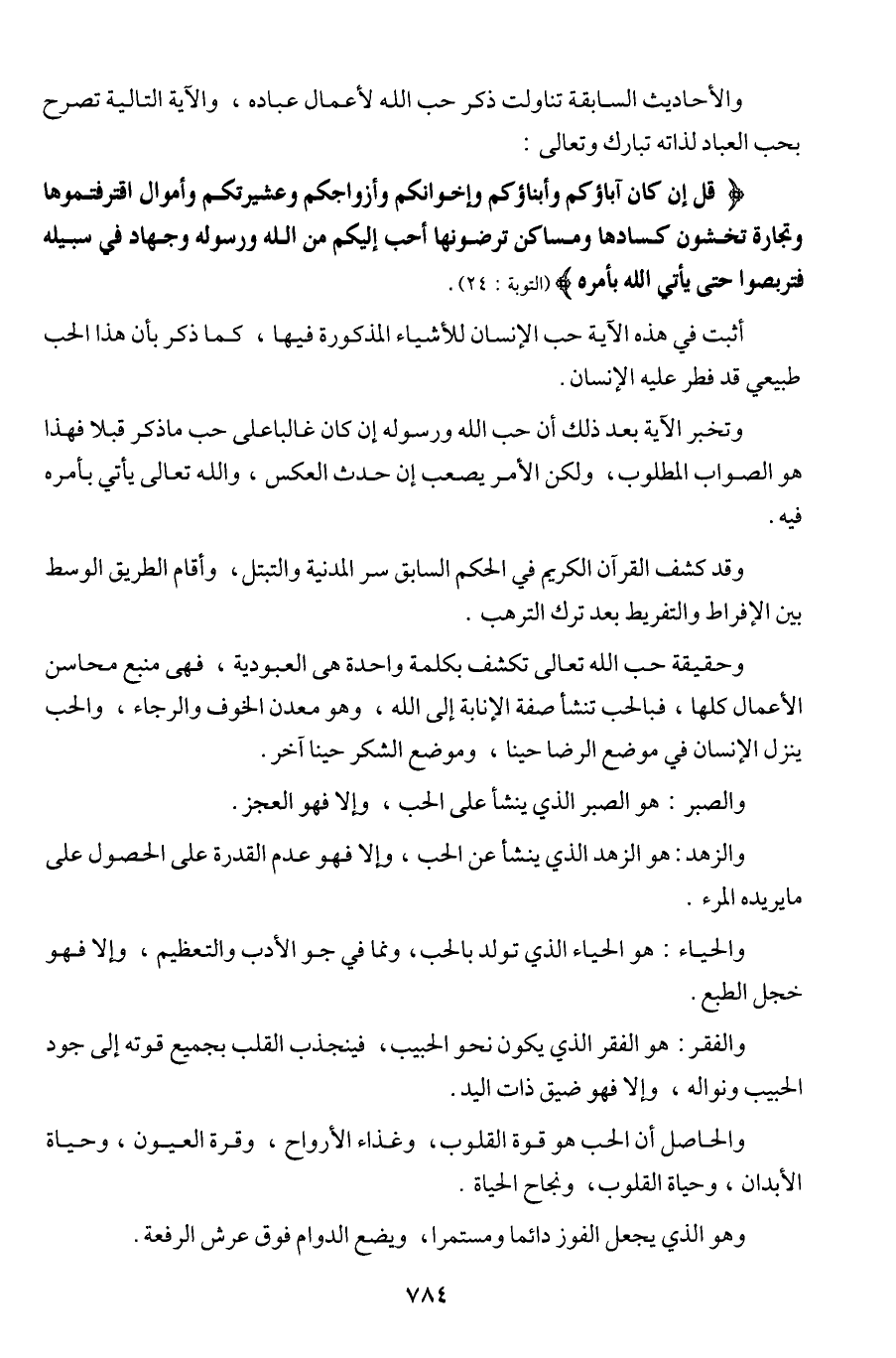 والحاصل أن الحب هو قوة القلوب، وغناء الأرواح، وقرة العيون، وحياة الأبدان، وحياة القلوب، ونجاح الحياة.