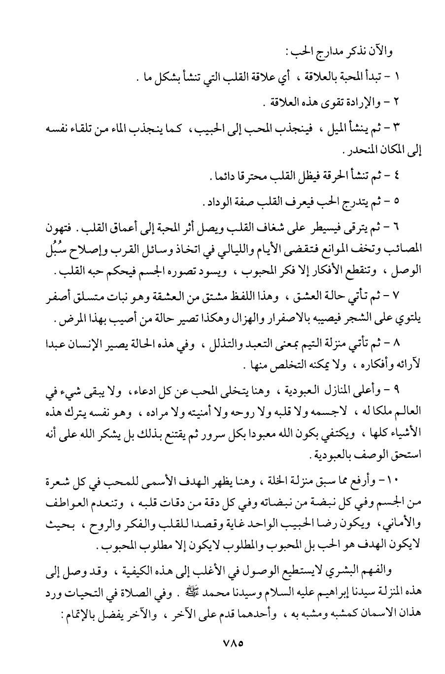 9 - وأعلى المنازل العبودية، وهنا يتخلى المحب عن كل ادعاء، ولا يبقى شيء في العالم ملكا له، لا جسمه ولا قلبه ولا روحه ولا أمنيته ولا مراده، وهو نفسه يترك هذه الأشياء كلها، ويكتفي بكون الله معبودا بكل سرور ثم يقتنع بذلك بل يشكر الله على أنه استحق الوصف بالعبودية.