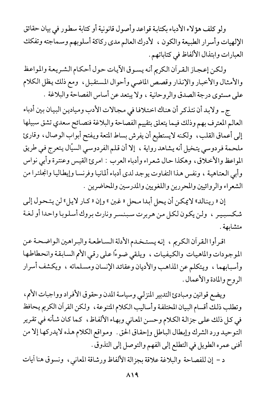 ج - ولابد أن نتذكر أن هناك اختلافا في مجالات الأدب وميادين البيان بين أدباء العالم المعترف بهم وذلك فيما يتعلق بتقييم الفصاحة والبلاغة فنصائح سعدي تشق سبيلها إلى أعماق القلب، ولكنه لا يستطيع أن يفرش بساط المتعة ويفتح أبواب الوصال، وقارئ ملحمة فردوسي يتخيل أنه يشاهد رواية، إلا أن قلم الفردوسي السيال يتعرج في طريق المواعظ والأخلاق، وهكذا حال شعراء وأدباء العرب: امرئ القيس وعنترة وأبي نواس وأبي العتاهية، ونفس هذا التفاوت يوجد لدى أدباء ألمانيا وفرنسا وإيطاليا وانجلترا من الشعراء والروائيين والمحررين واللغويين والمدرسين والمحاضرين.