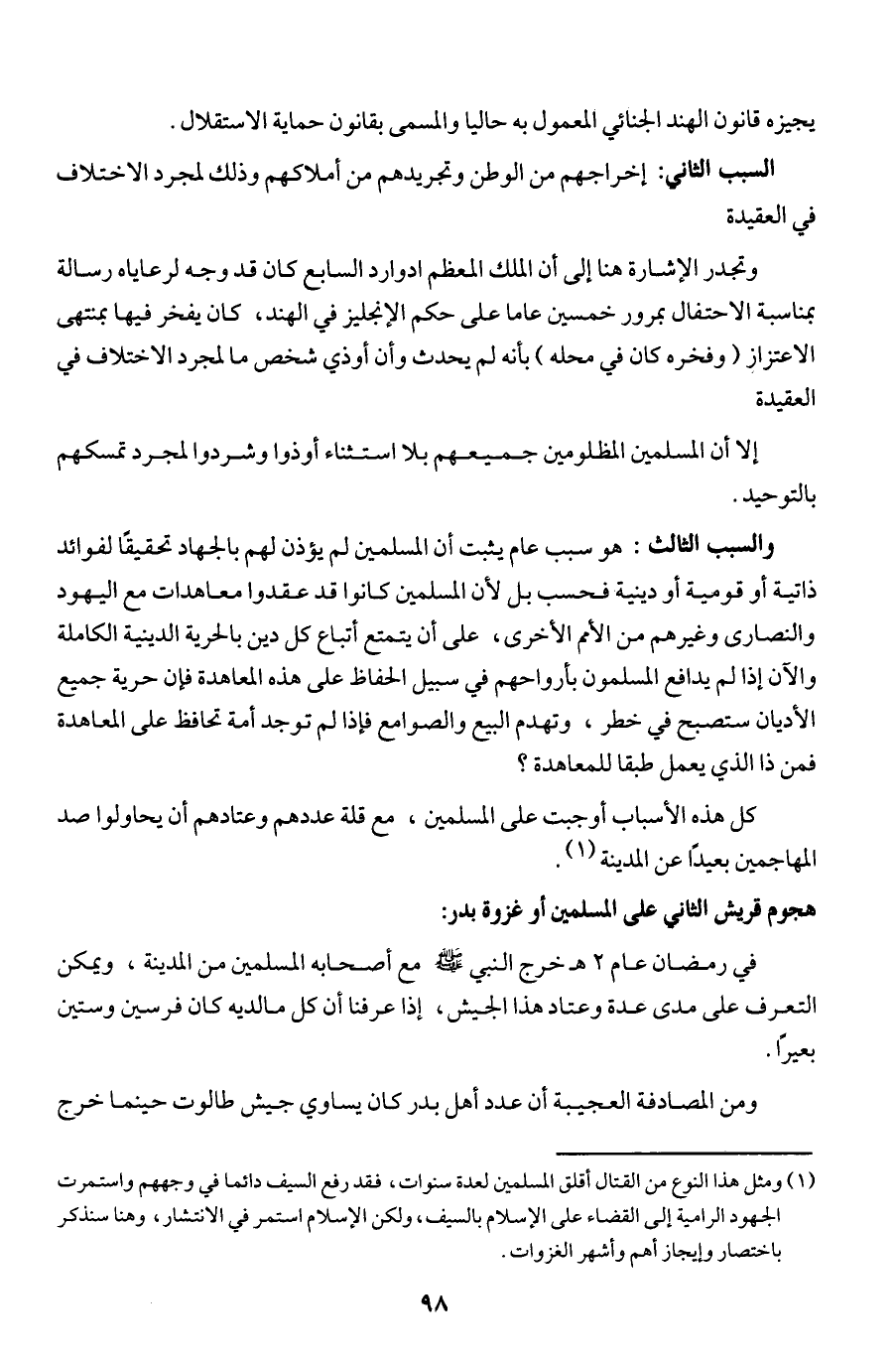 والسبب الثالث: هو سبب عام يثبت أن المسلمين لم يؤذن لهم بالجهاد تحقيقا لفوائد ذاتية أو قومية أو دينية فحسب بل لأن المسلمين كانوا قد عقدوا معاهدات مع اليهود والنصارى وغيرهم من الأمم الأخرى، على أن يتمتع أتباع كل دين بالحرية الدينية الكاملة والآن إذا لم يدافع المسلمون بأرواحهم في سبيل الحفاظ على هذه المعاهدة فإن حرية جميع الأديان ستصبح في خطر، وتهدم البيع والصوامع فإذا لم توجد أمة تحافظ على المعاهدة فمن ذا الذي يعمل طبقا للمعاهدة؟