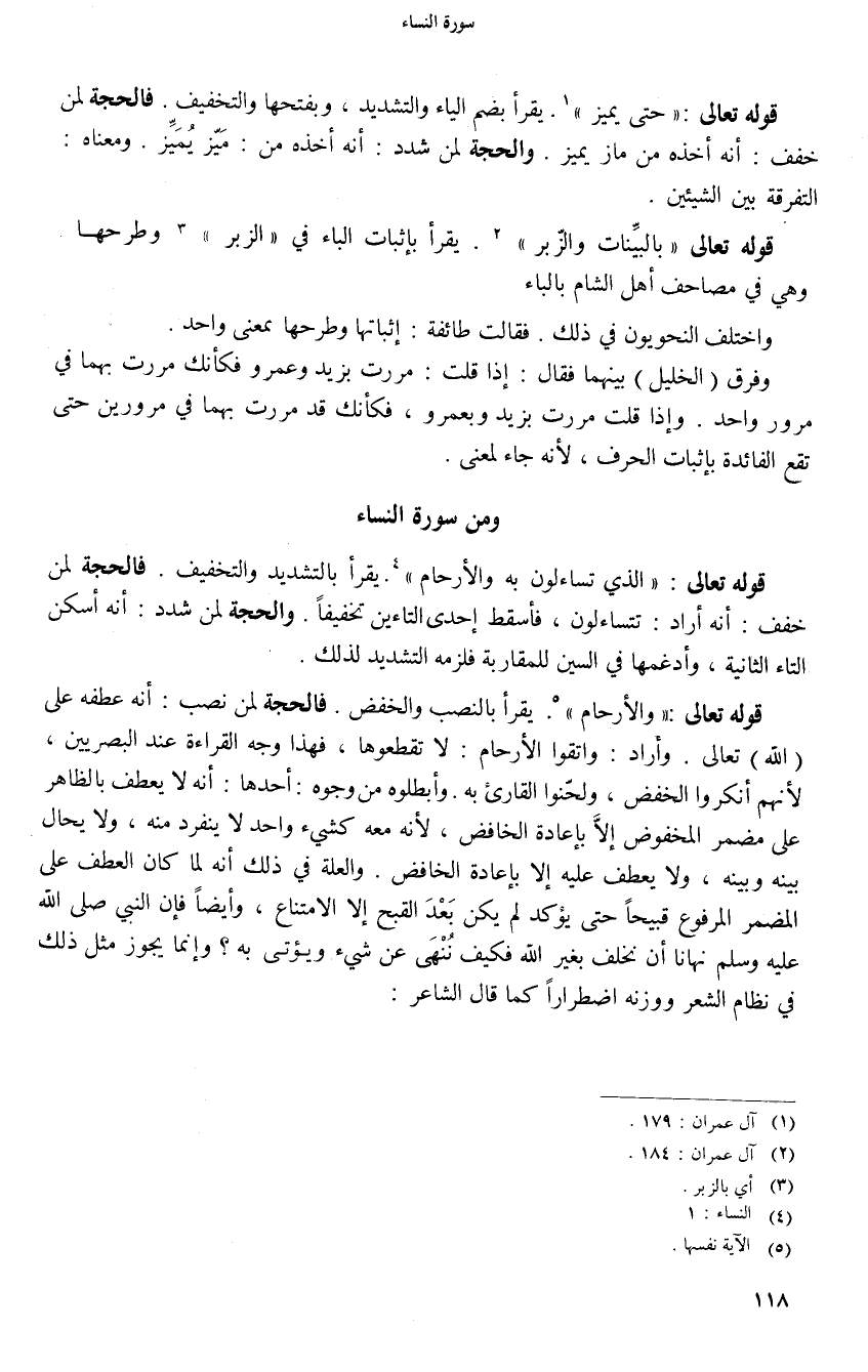 قوله تعالى: الَّذِي تَسائَلُونَ بِهِ وَالْأَرْحامَ «4». يقرأ بالتشديد والتخفيف. فالحجة لمن خفف: أنه أراد: تتساءلون، فأسقط إحدى التاءين تخفيفا. والحجة لمن شدد: أنه أسكن التاء الثانية، وأدغمها في السين للمقاربة فلزمه التشديد لذلك.
