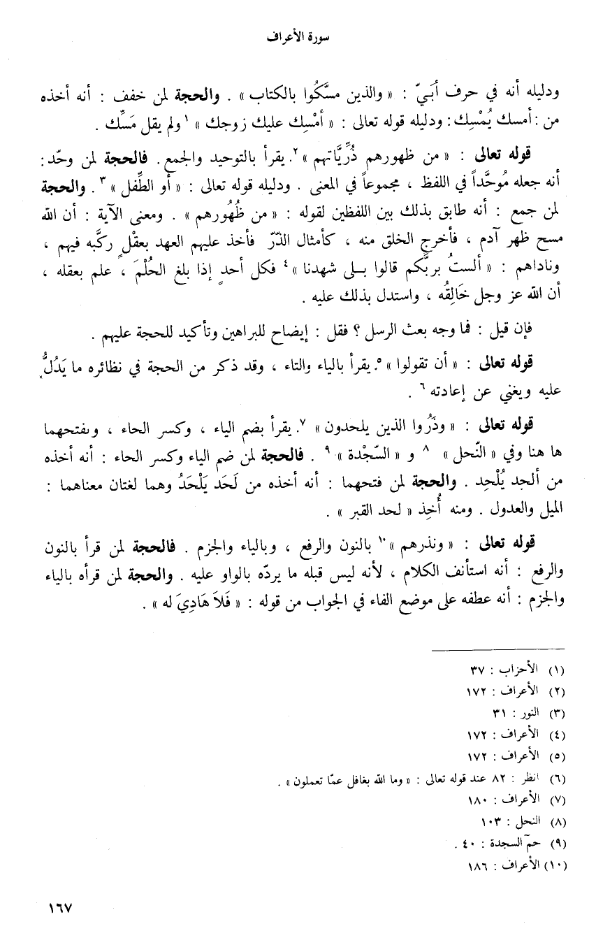 أنه جعله موحّدا في اللفظ، مجموعا في المعنى. ودليله قوله تعالى: أَوِ الطِّفْلِ «3». والحجة لمن جمع: أنه طابق بذلك بين اللفظين لقوله: «مِنْ ظُهُورِهِمْ». ومعنى الآية: أن الله مسح ظهر آدم، فأخرج الخلق منه، كأمثال الذّرّ فأخذ عليهم العهد بعقل ركّبه فيهم، وناداهم: أَلَسْتُ بِرَبِّكُمْ قالُوا بَلى شَهِدْنا «4» فكل أحد إذا بلغ الحلم، علم بعقله، أن الله عز وجل خالقه، واستدل بذلك عليه.