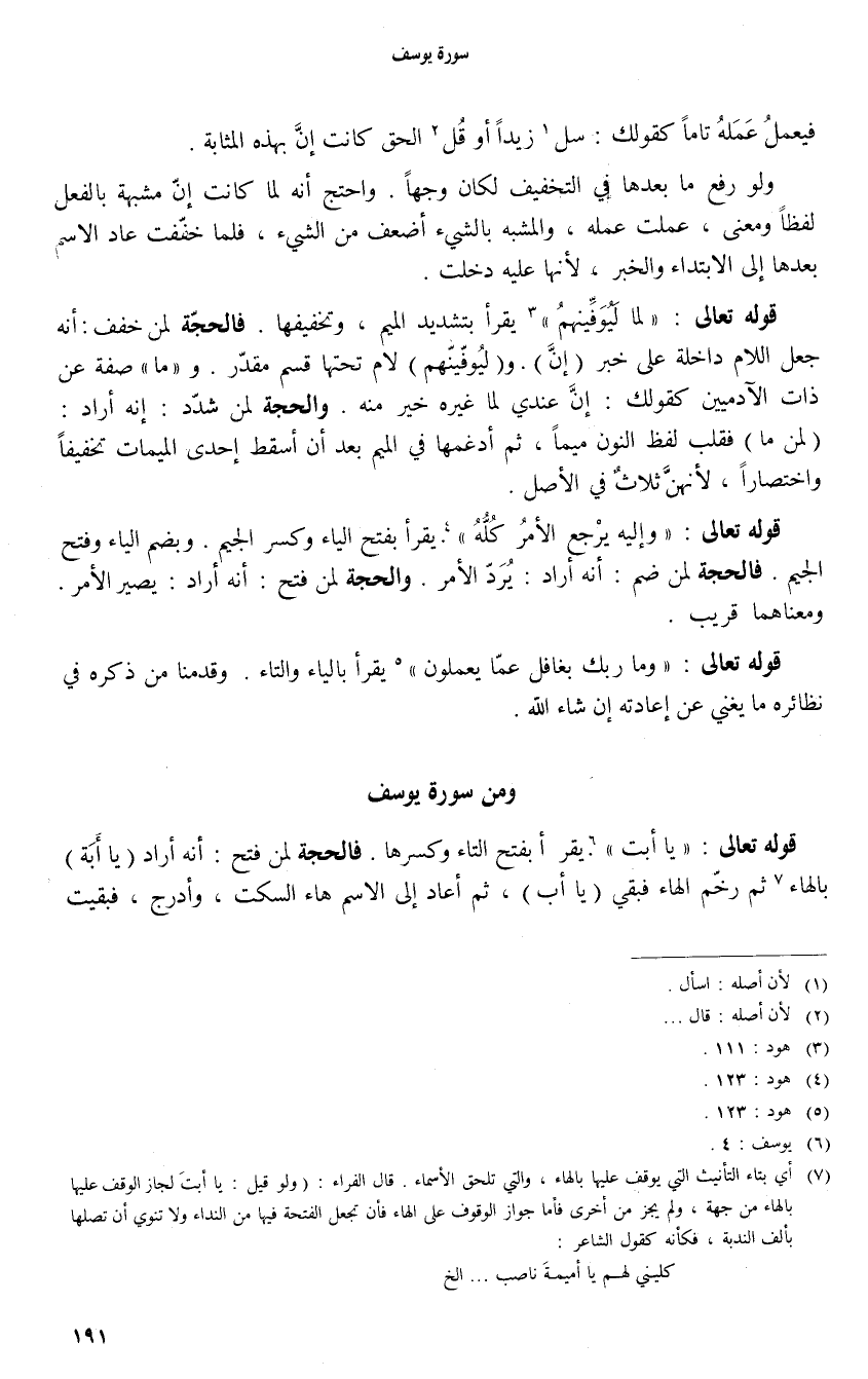 (7) أي بتاء التأنيث التي يوقف عليها بالهاء، والتي تلحق الأسماء. قال الفراء: (ولو قيل: يا أبت لجاز الوقف عليها بالهاء من جهة، ولم يجز من أخرى فأما جواز الوقوف على الهاء فأن تجعل الفتحة فيها من النداء ولا تنوي أن تصلها بألف الندبة، فكأنه كقول الشاعر: