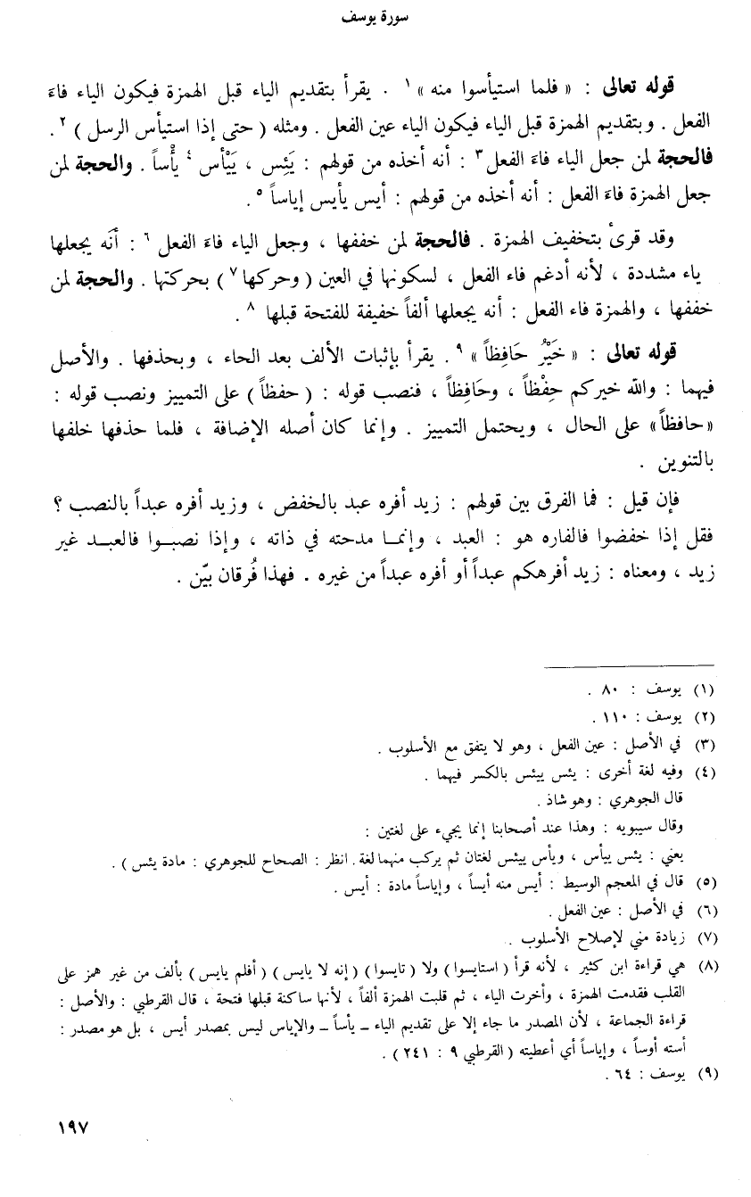 قوله تعالى: خَيْرٌ حافِظاً «9». يقرأ بإثبات الألف بعد الحاء، وبحذفها. والأصل فيهما: والله خيركم حفظا، وحافظا، فنصب قوله: (حفظا) على التمييز ونصب قوله: