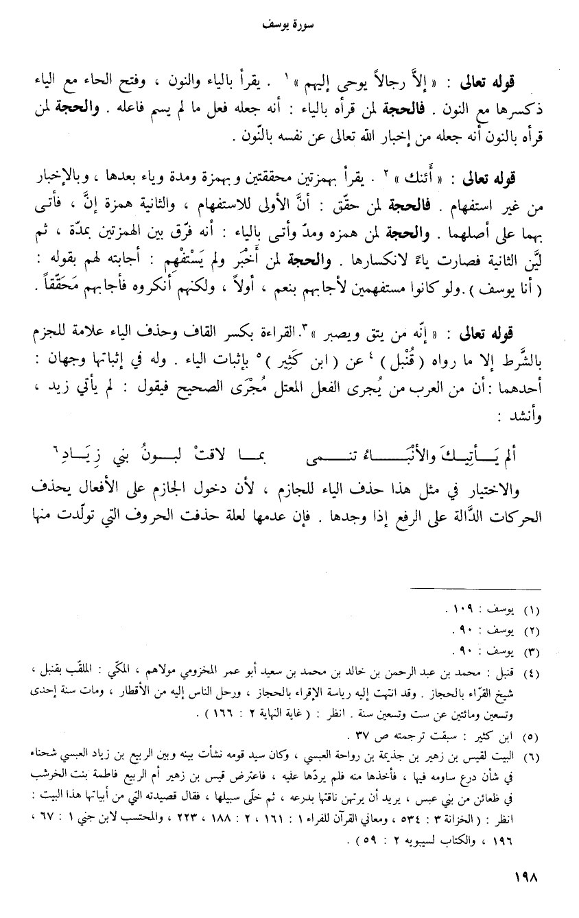 قوله تعالى: إِنَّهُ مَنْ يَتَّقِ وَيَصْبِرْ «3». القراءة بكسر القاف وحذف الياء علامة للجزم بالشّرط إلا ما رواه (قنبل) «4» عن (ابن كثير) «5» بإثبات الياء. وله في إثباتها وجهان: