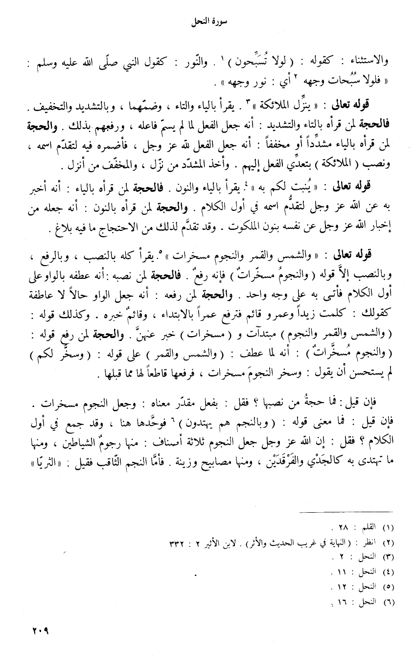 قوله تعالى: وَالشَّمْسَ وَالْقَمَرَ وَالنُّجُومُ مُسَخَّراتٌ «5». يقرأ كله بالنصب، وبالرفع، وبالنصب إلّا قوله وَالنُّجُومُ مُسَخَّراتٌ فإنه رفع. فالحجة لمن نصبه: أنه عطفه بالواو على أول الكلام فأتى به على وجه واحد. والحجة لمن رفعه: أنه جعل الواو حالا لا عاطفة كقولك: كلمت زيدا وعمرو قائم فترفع عمرا بالابتداء، وقائم خبره. وكذلك قوله: