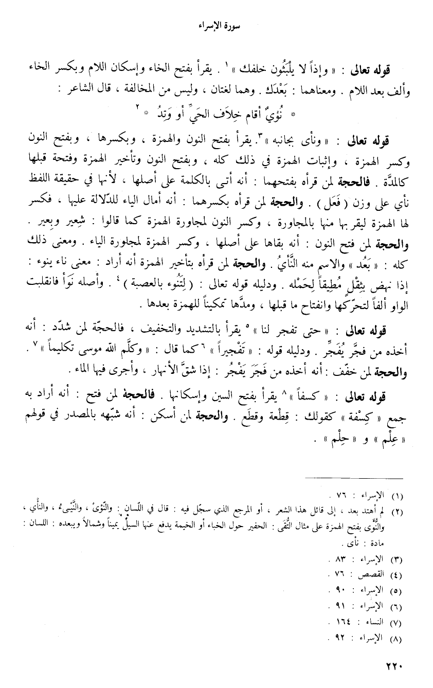 «2» قوله تعالى: وَنَأى بِجانِبِهِ «3». يقرأ بفتح النون والهمزة، وبكسرها، وبفتح النون وكسر الهمزة، وإثبات الهمزة في ذلك كله، وبفتح النون وتأخير الهمزة وفتحة قبلها كالمدّة. فالحجة لمن قرأه بفتحهما: أنه أتى بالكلمة على أصلها، لأنها في حقيقة اللفظ نأي على وزن (فعل). والحجة لمن قرأه بكسرهما: أنه أمال الياء للدّلالة عليها، فكسر لها الهمزة ليقربها منها بالمجاورة، وكسر النون لمجاورة الهمزة كما قالوا: شعير وبعير.