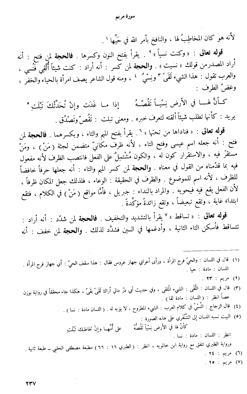 قوله تعالى: فَناداها مِنْ تَحْتِها «6». يقرأ بفتح الميم والتاء، وبكسرهما. فالحجة لمن فتح: أنه جعله اسم عيسى وفتح التاء، لأنه ظرف مكانيّ متضمن لجثة (من)، ومن مستقرّ فيه، والاستقرار كون له، والكون مشتمل على الفعل فانتصب الظرف لأنه مفعول فيه بما قدّمناه من القول في معناه. والحجة لمن كسر الميم والتاء: أنه جعلها حرفا خافضا للظرف، لأنه اسم للموضوع. والظرف في الحقيقة: الوعاء، فلذلك جعل المكان ظرفا، لأن الفعل يقع فيه فيحويه. والمراد بالنداء: جبريل، فأمّا مواقع (من) في الكلام، فتقع ابتداء غاية، وتقع تبعيضا، وتقع زائدة مؤكّدة.