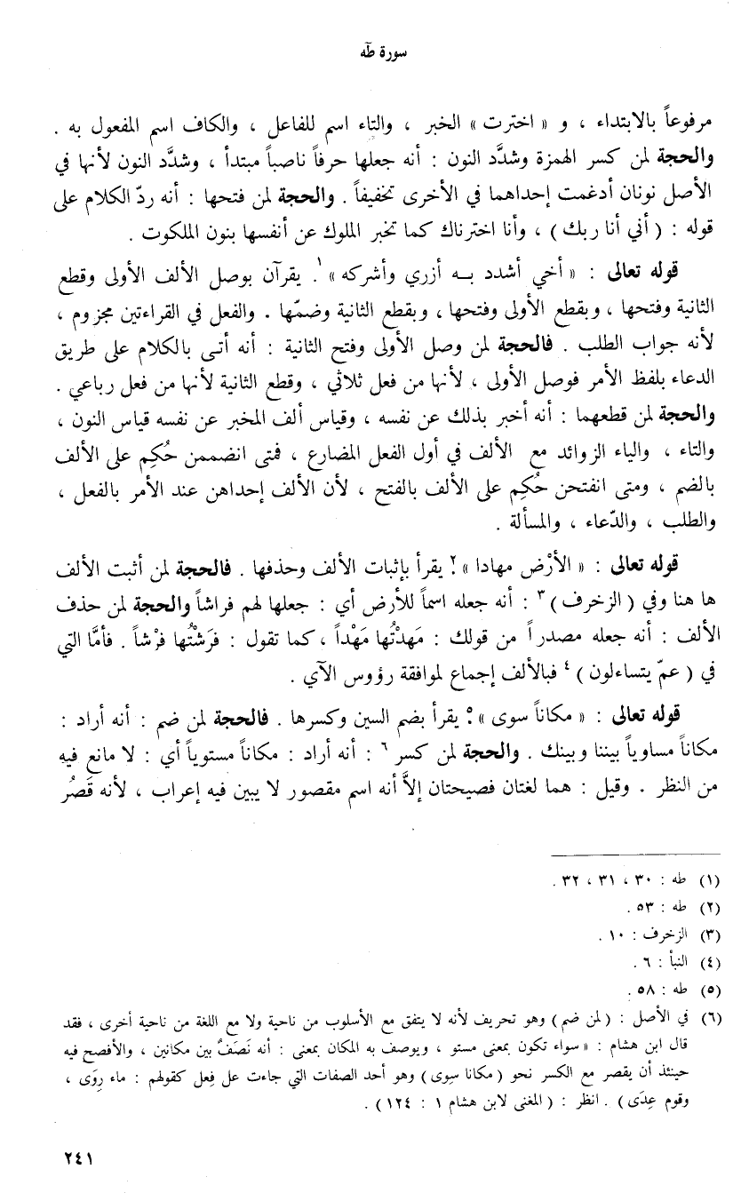مكانا مساويا بيننا وبينك. والحجة لمن كسر «6»: أنه أراد: مكانا مستويا أي: لا مانع فيه من النظر. وقيل: هما لغتان فصيحتان إلّا أنه اسم مقصور لا يبين فيه إعراب، لأنه قصر