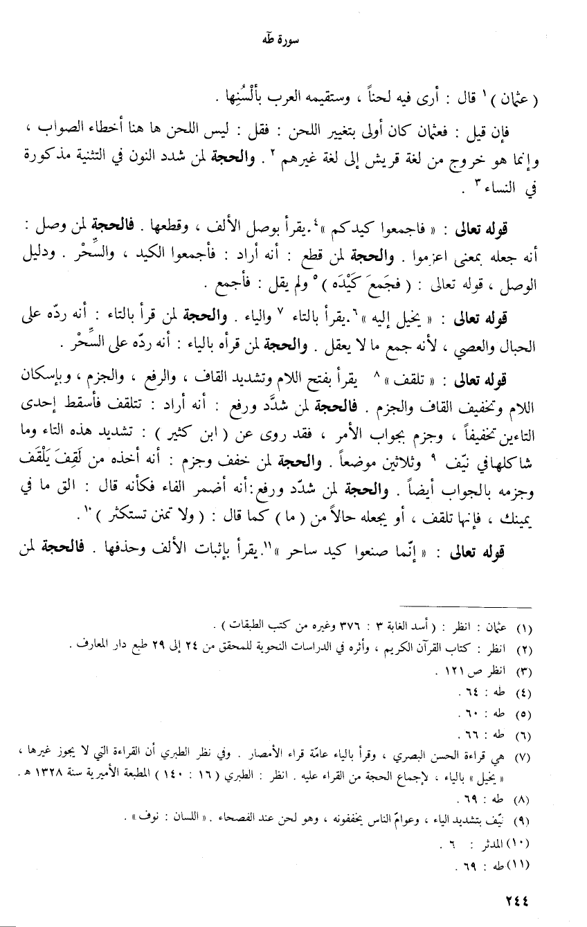فإن قيل: فعثمان كان أولى بتغيير اللحن: فقل: ليس اللحن هاهنا أخطاء الصواب، وإنما هو خروج من لغة قريش إلى لغة غيرهم «2». والحجة لمن شدد النون في التثنية مذكورة في النساء «3».