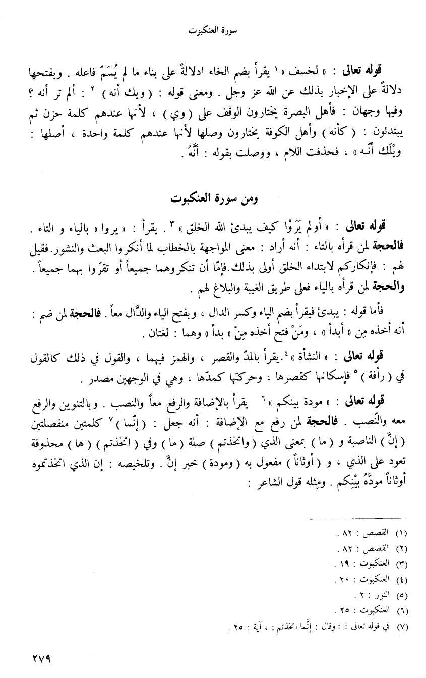قوله تعالى: مَوَدَّةَ بَيْنِكُمْ «6» يقرأ بالإضافة والرفع معا والنصب. وبالتنوين والرفع معه والنّصب. فالحجة لمن رفع مع الإضافة: أنه جعل: (إنّما) «7» كلمتين منفصلتين (إنّ) الناصبة و (ما) بمعنى الذي (واتخذتم) صلة (ما) وفي (اتخذتم) (ها) محذوفة تعود على الذي، و (أوثانا) مفعول به (ومودة) خبر إنّ. وتلخيصه: إن الذي اتخذتموه أوثانا مودّة بينكم. ومثله قول الشاعر: