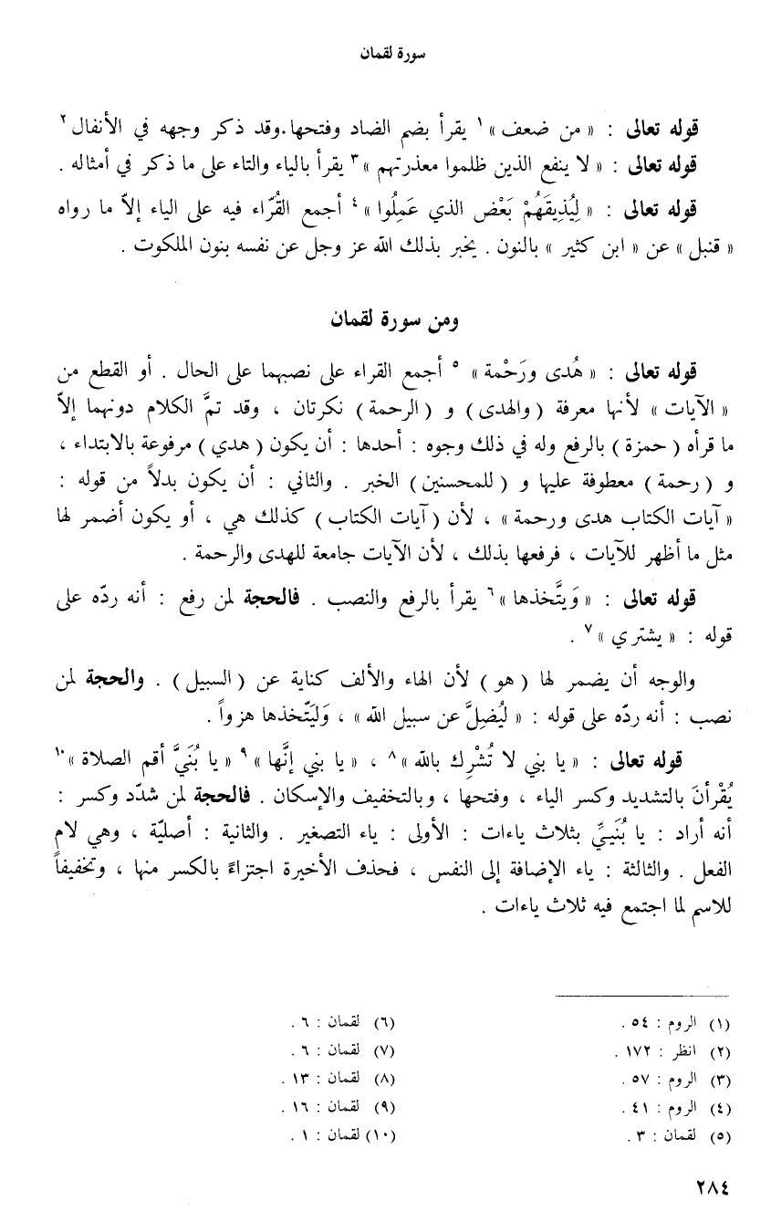 قوله تعالى: هُدىً وَرَحْمَةً «5» أجمع القراء على نصبهما على الحال. أو القطع من «الآيات» لأنها معرفة (والهدى) و (الرحمة) نكرتان، وقد تمّ الكلام دونهما إلّا ما قرأه (حمزة) بالرفع وله في ذلك وجوه: أحدها: أن يكون (هدي) مرفوعة بالابتداء، و (رحمة) معطوفة عليها و (للمحسنين) الخبر. والثاني: أن يكون بدلا من قوله: