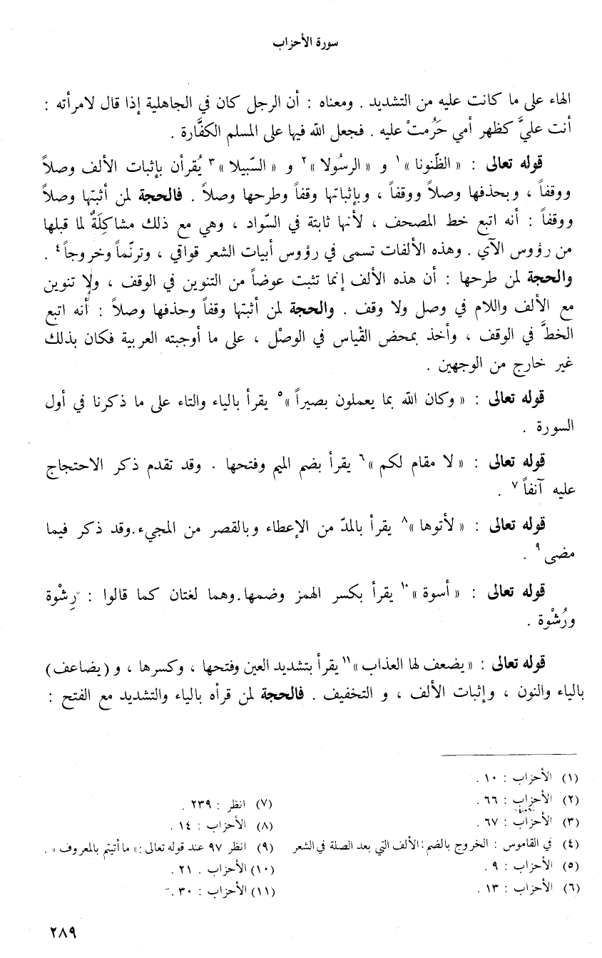 قوله تعالى: الظُّنُونَا «1» والرَّسُولَا «2» والسَّبِيلَا «3» يقرأن بإثبات الألف وصلا ووقفا، وبحذفها وصلا ووقفا، وبإثباتها وقفا وطرحها وصلا. فالحجة لمن أثبتها وصلا ووقفا: أنه اتبع خط المصحف، لأنها ثابتة في السّواد، وهي مع ذلك مشاكلة لما قبلها من رءوس الآي. وهذه الألفات تسمى في رءوس أبيات الشعر قوافي، وترنّما وخروجا «4».
